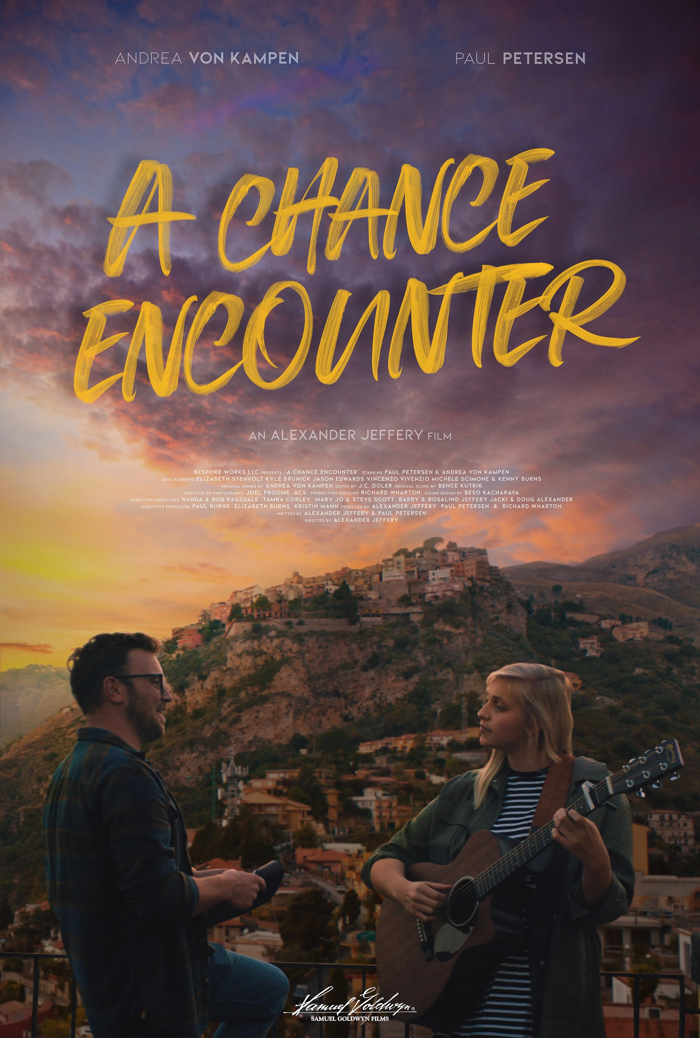 A Chance Encounter, formerly known as Molto Bella, was filmed at the end of 2019 in Taormina, Sicily on a shoe-string budget and premiered virtually at the prestigious Heartland International Film Festival in October of 2020 where it won the Audience Choice Award. Samuel Goldwyn Films picked up the film for worldwide distribution and released the film On-Demand and in limited theaters in October of 2022.